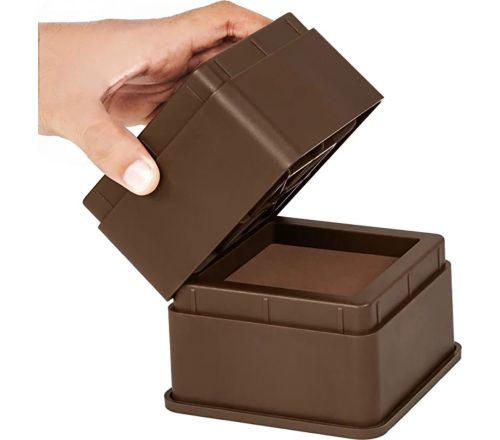 Sterke bedverhogers, belastbaar tot 1000 kg per set. Verhogen bed of stoel met 5 cm per stuk, stapelbaar tot 20 cm. Geschikt voor poten tot 8,2 cm.