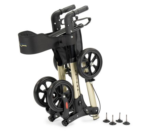 Om de rollator op te vouwen word de zitting omhoog getrokken. Om de rollator dubbel op te vouwen moeten er 4 schroefknoppen uit het frame worden gedraaid, de rollator word dan een compact pakketje van 63 x 34 x 28 cm en past dan in de (optioneel te bestellen) draagtas. Als de rollator regelmatig dubbel opgevouwen moet worden om bijvoorbeeld in een auto te vervoeren dan raden we de MultiMotion Double aan, deze is veel sneller dubbel op te vouwen.
