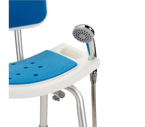 Deze douchestoel is voorzien van een comfortabele blauwe anti-slip bekleding, waardoor u stevig en prettig zit tijdens het douchen. De zithoogte is verstelbaar van 35 tot 52 cm in maar liefst 15 verschillende standen. De zitting is voorzien van waterafvoergaten en heeft aan beide zijden handgrepen, wat zorgt voor extra ondersteuning en makkelijk verplaatsen. Aan weerszijden bevindt zich bovendien een handige douchekophouder.