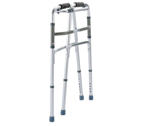 Lichtgewicht aluminium looprek van slechts 2,2 kg. In hoogte verstelbaar van 75 tot 93 cm en eenvoudig inklapbaar voor compact opbergen en meenemen.