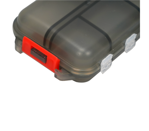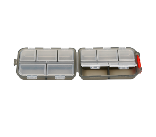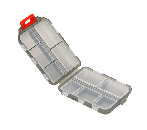 Handig pillendoosje van MultiMotion met 10 vakjes en transparante dekseltjes. Compact reismodel van donkergrijs kunststof met rood clipje, ideaal voor onderweg.