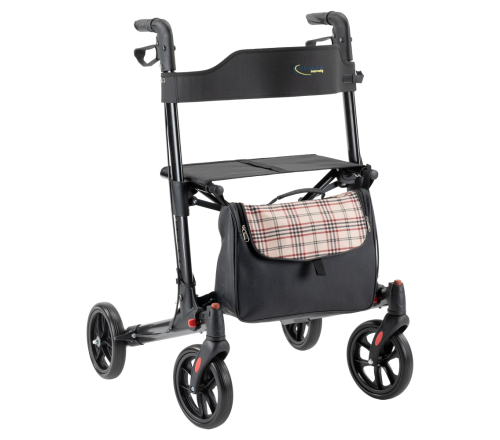Skai leren rollatortas met ruitmotief, ruim vak en ritssluiting. Ook los te gebruiken dankzij handgreep. Snel en eenvoudig te bevestigen.