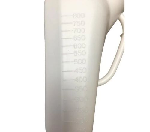 Unisex urinaal voor man en vrouw, met opzetstuk en anti-mors deksel. Voorzien van handige maataanduiding. Inhoud: 800 ml. Kleur: wit.