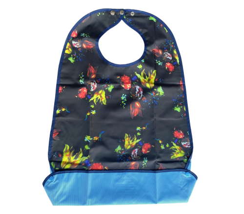 Deze slab voor volwassenen biedt uitstekende bescherming tegen morsen tijdens het eten en helpt kleding schoon te houden. Dankzij de sluiting met drukknopen in de nek is de slab eenvoudig aan en uit te doen. Onder aan de slab zitten extra drukknopen waarmee je desgewenst een opvangbakje kunt vormen – handig om eten op te vangen. De waterdichte achterkant voorkomt doorlekken en de slab is wasbaar tot 90 graden.